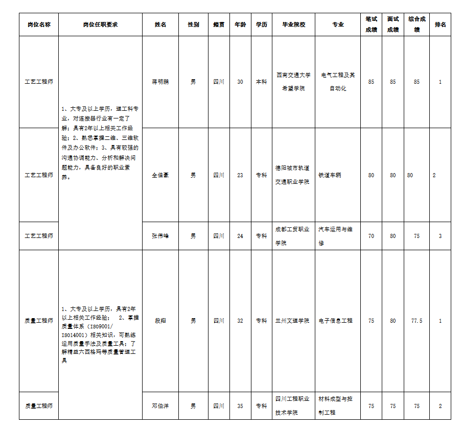根據(jù)四川華豐科技股份有限公司發(fā)布的招聘公告及招聘相關(guān)規(guī)定,經(jīng)筆試、面試等程序,現(xiàn)將筆試(面試)成績予以公示。