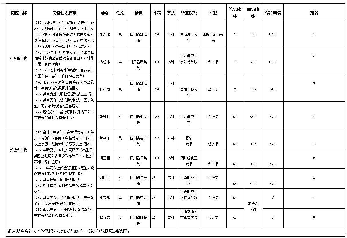 根據(jù)綿陽(yáng)市投資控股(集團(tuán))有限公司發(fā)布的招聘公告及招聘相關(guān)規(guī)定,經(jīng)筆試、面試等程序,現(xiàn)將筆試(面試)成績(jī)予以公示。