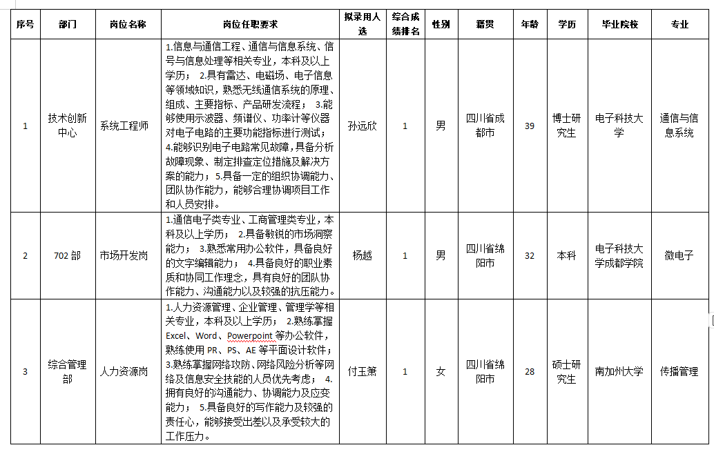 根據(jù)四川九州電器集團(tuán)有限責(zé)任公司發(fā)布的招聘公告及招聘相關(guān)規(guī)定,經(jīng)筆試、面試、考察、體檢等程序,擬錄用孫遠(yuǎn)欣,付玉簫,楊越同志到四川九州電器集團(tuán)有限責(zé)任公司工作,現(xiàn)予以公示,具體情況如下: