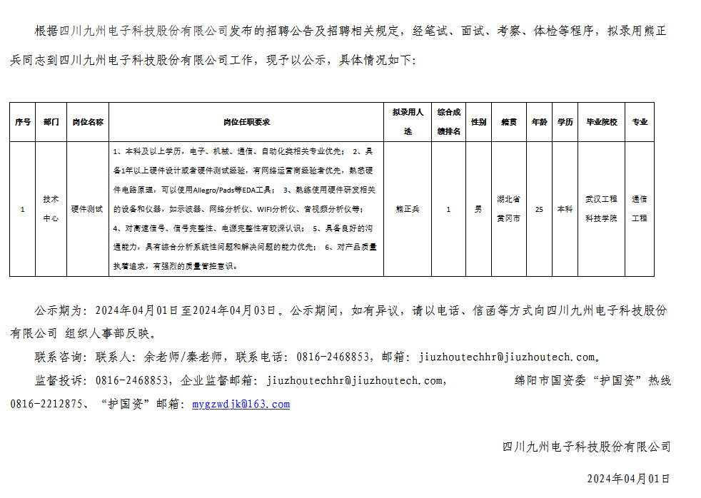 四川九州電子科技股份有限公司關(guān)于招聘硬件測(cè)試崗位擬錄用人員的公示