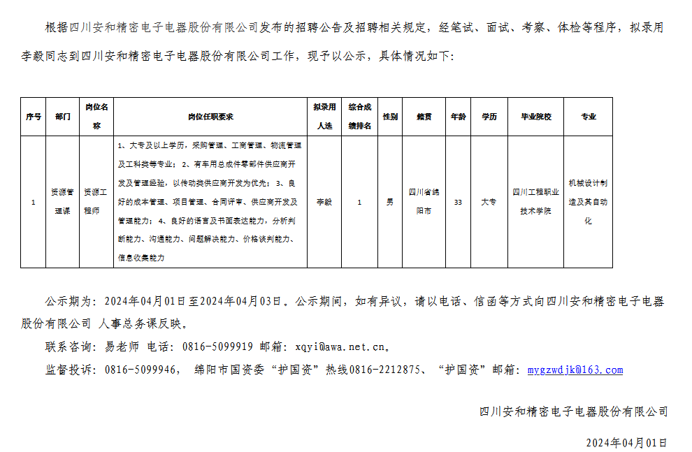 四川安和精密電子電器股份有限公司關(guān)于招聘資源工程師擬錄用人員的公示