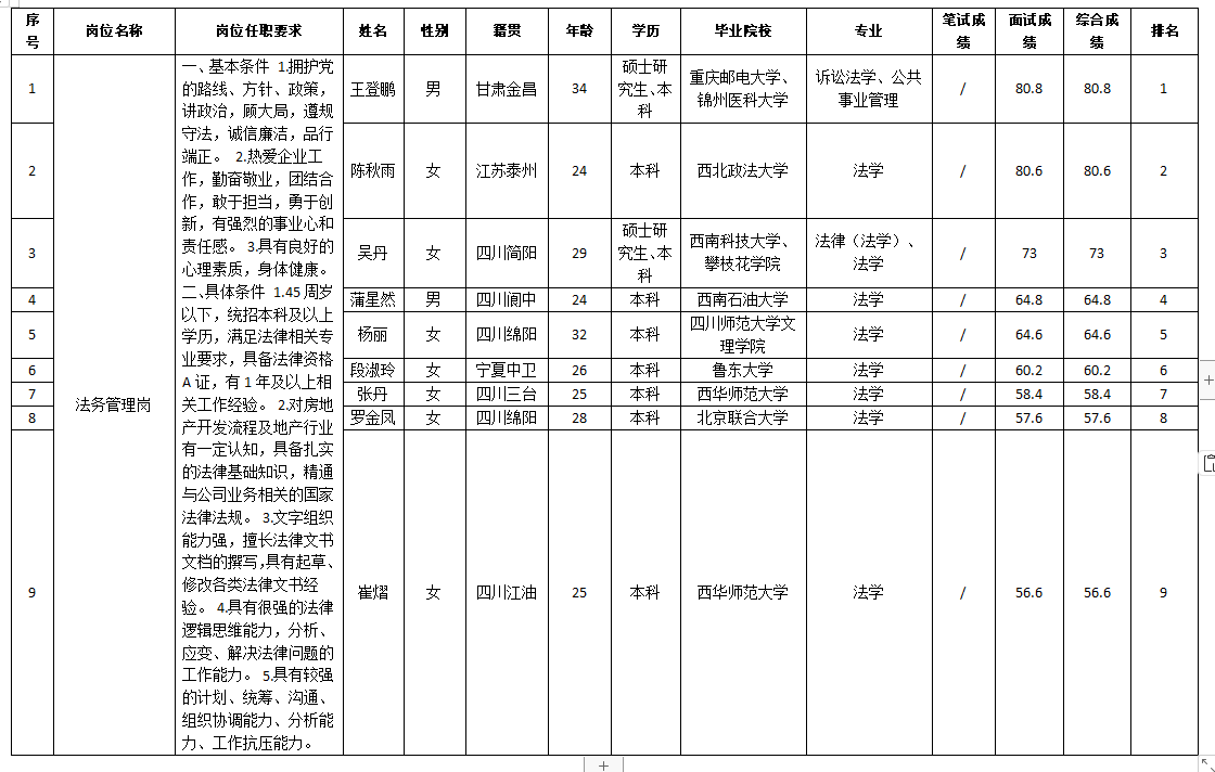 根據(jù)九州千城置業(yè)有限責(zé)任公司發(fā)布的招聘公告及招聘相關(guān)規(guī)定,經(jīng)筆試、面試等程序,現(xiàn)將筆試(面試)成績予以公示。