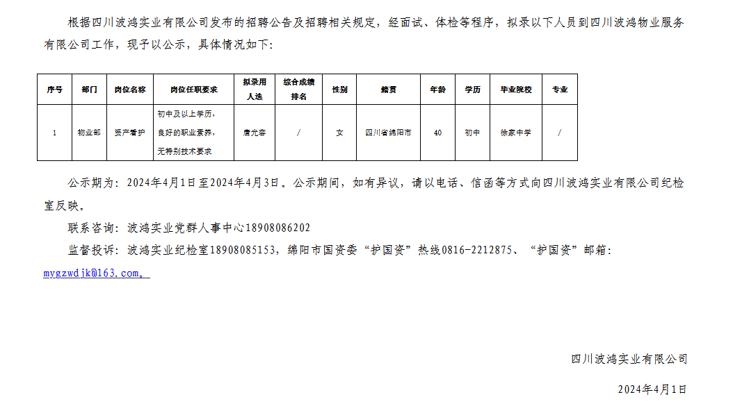 四川波鴻實業(yè)有限公司關(guān)于招聘四川波鴻物業(yè)服務(wù)有限公司資產(chǎn)看護擬錄用人員的公示
