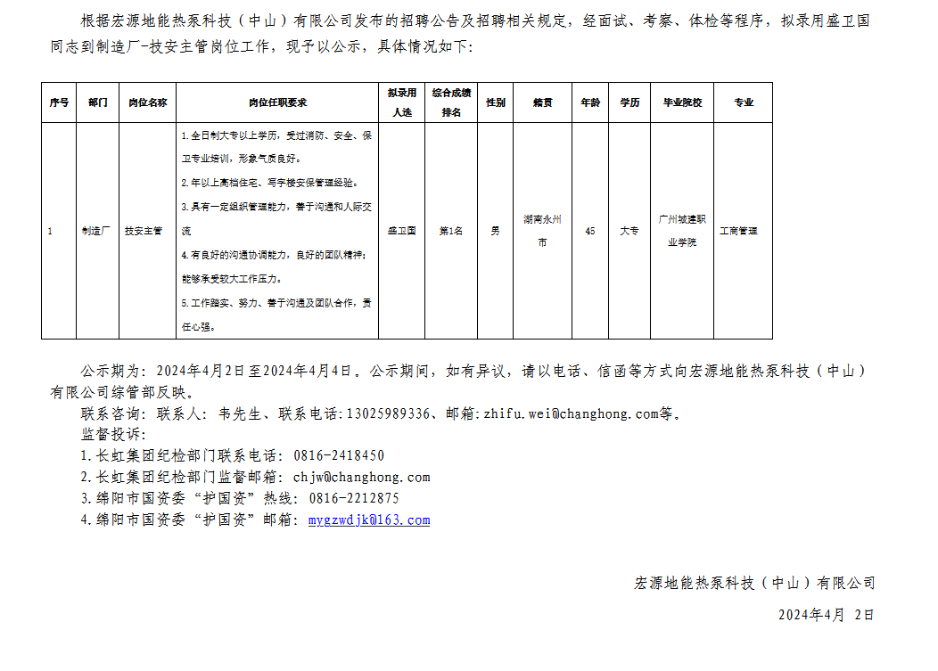 宏源地能熱泵科技(中山)有限公司關(guān)于招聘技安主管擬錄用人員的公示
