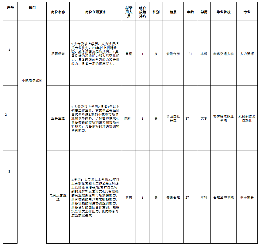 根據(jù)合肥長(zhǎng)虹美菱生活電器有限公司發(fā)布的招聘公告及招聘相關(guān)規(guī)定,經(jīng)筆試、面試、考察、體檢等程序,擬錄用童暢等同志到小家電事業(yè)部工作,現(xiàn)予以公示,具體情況如下: