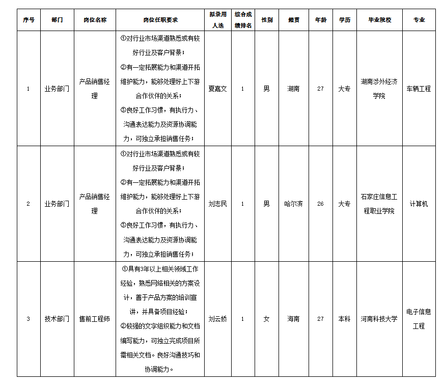 根據(jù)四川長(zhǎng)虹佳華信息產(chǎn)品有限責(zé)任公司發(fā)布的招聘公告及招聘相關(guān)規(guī)定,經(jīng)面試、考察、體檢等程序,擬錄用夏嘉文、劉志民、劉云嬌同志到四川長(zhǎng)虹佳華信息產(chǎn)品有限責(zé)任公司工作,現(xiàn)予以公示,具體情況如下: