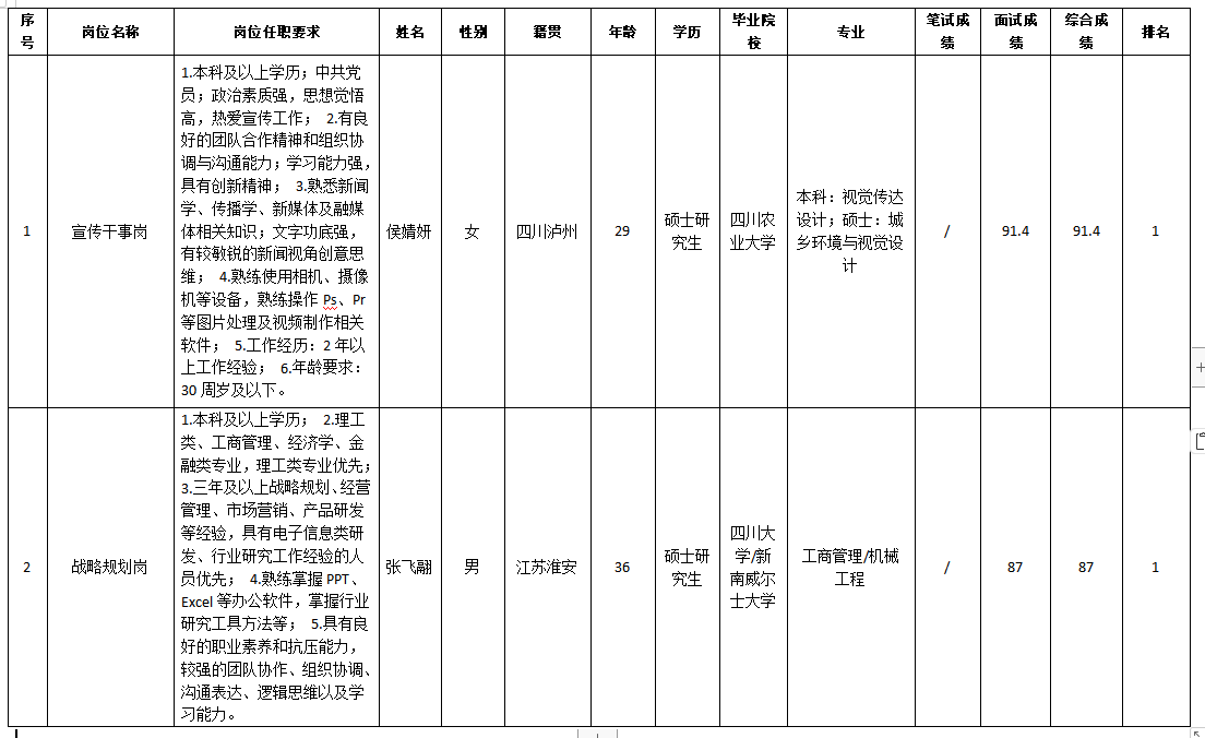 根據(jù)四川九州投資控股集團(tuán)有限公司發(fā)布的招聘公告及招聘相關(guān)規(guī)定,經(jīng)筆試、面試等程序,現(xiàn)將筆試(面試)成績予以公示。