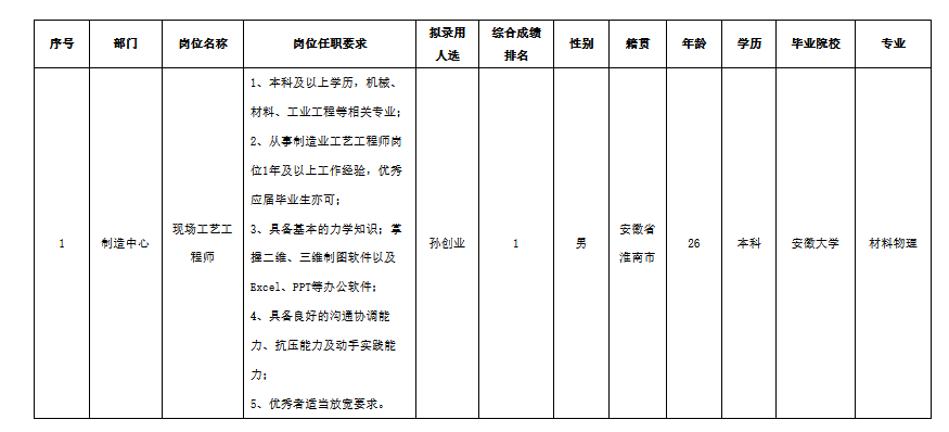 根據(jù)中科美菱低溫科技股份有限公司(以下簡(jiǎn)稱“中科美菱”)發(fā)布的招聘公告及招聘相關(guān)規(guī)定,經(jīng)筆試、面試、考察、體檢等程序,擬錄用孫創(chuàng)業(yè)同志到中科美菱工作,現(xiàn)予以公示,具體情況如下:
