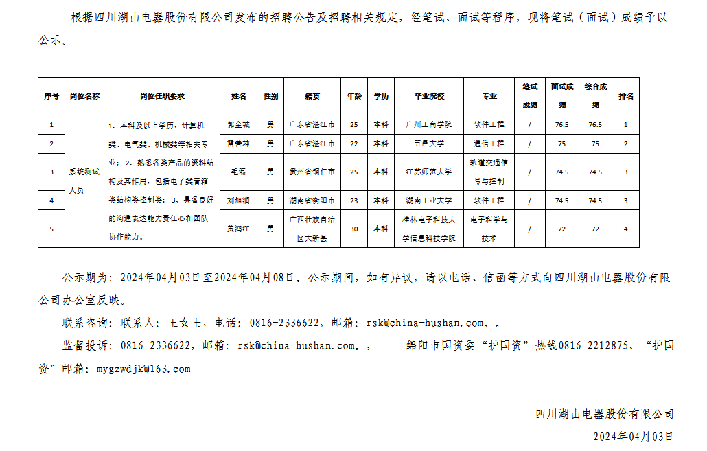 四川湖山電器股份有限公司關(guān)于招聘系統(tǒng)測試人員測試成績的公示