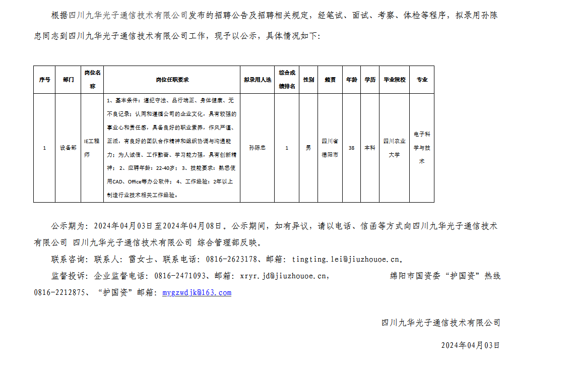 四川九華光子通信技術(shù)有限公司關(guān)于招聘IE工程師擬錄用人員的公示