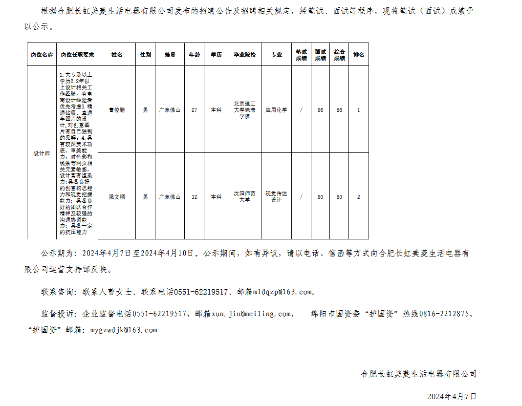 合肥長虹美菱生活電器有限公司關(guān)于招聘設(shè)計(jì)師測試成績的公示