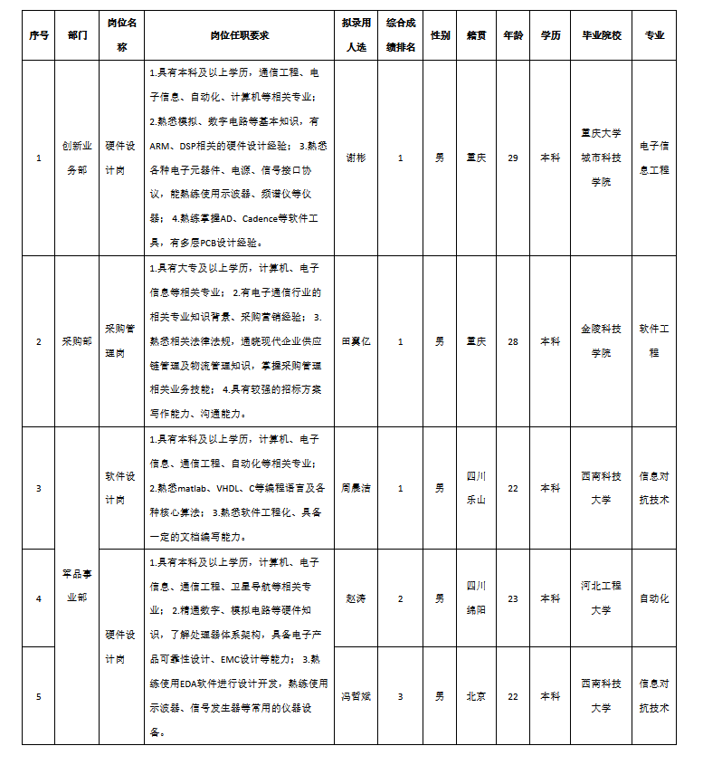 根據(jù)重慶九州星熠導(dǎo)航設(shè)備有限公司發(fā)布的招聘公告及招聘相關(guān)規(guī)定,經(jīng)筆試、面試、考察、體檢等程序,擬錄用謝彬,趙濤,馮哲斌,周晨潔,田翼億同志到重慶九州星熠導(dǎo)航設(shè)備有限公司工作,現(xiàn)予以公示,具體情況如下: