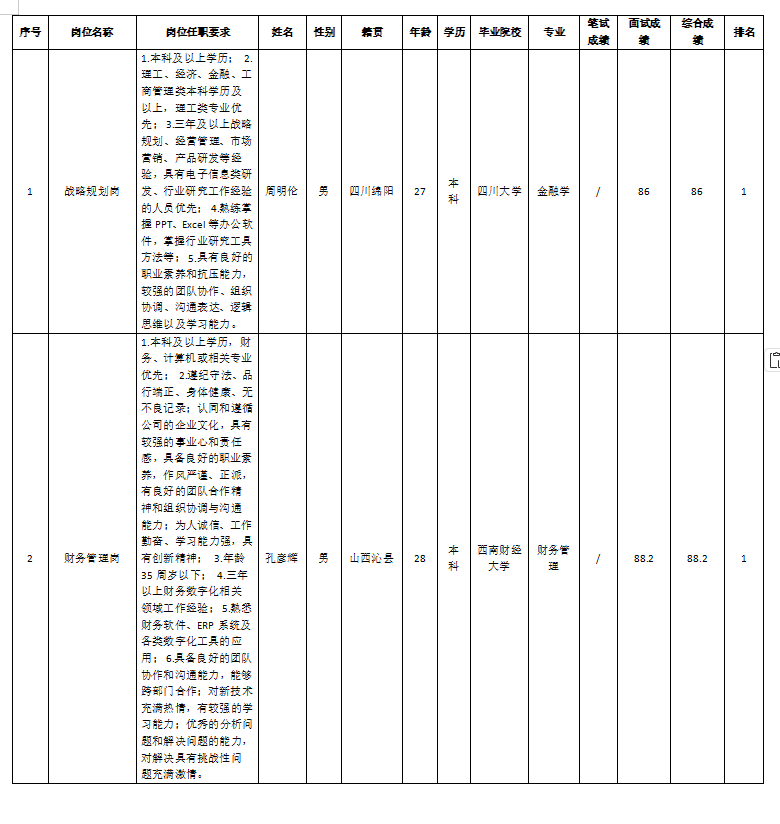 根據(jù)四川九洲投資控股集團(tuán)有限公司發(fā)布的招聘公告及招聘相關(guān)規(guī)定,經(jīng)筆試、面試等程序,現(xiàn)將筆試(面試)成績(jī)予以公示。