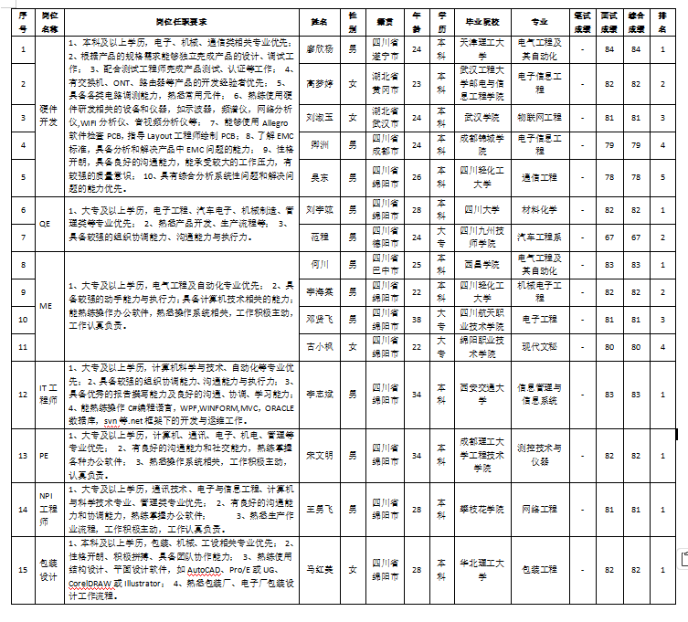 根據(jù)四川九州電子科技股份有限公司發(fā)布的招聘公告及招聘相關(guān)規(guī)定,經(jīng)筆試、面試等程序,現(xiàn)將筆試(面試)成績予以公示。