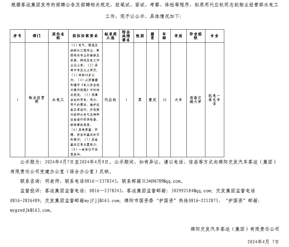 綿陽交發(fā)汽車客運(yùn)(集團(tuán))有限責(zé)任公司關(guān)于招聘水電工擬錄用人員的公示