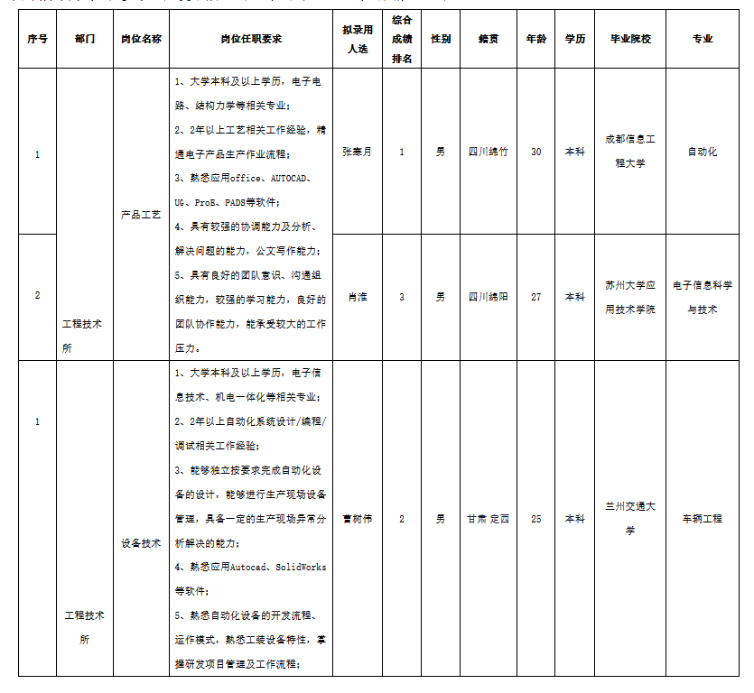 根據(jù)四川長虹電器股份有限公司(智慧顯示)公司發(fā)布的招聘公告及招聘相關(guān)規(guī)定,經(jīng)筆試、面試、考察、體檢等程序,擬錄用張寒月等同志到工程技術(shù)所工作,現(xiàn)予以公示,具體情況如下: