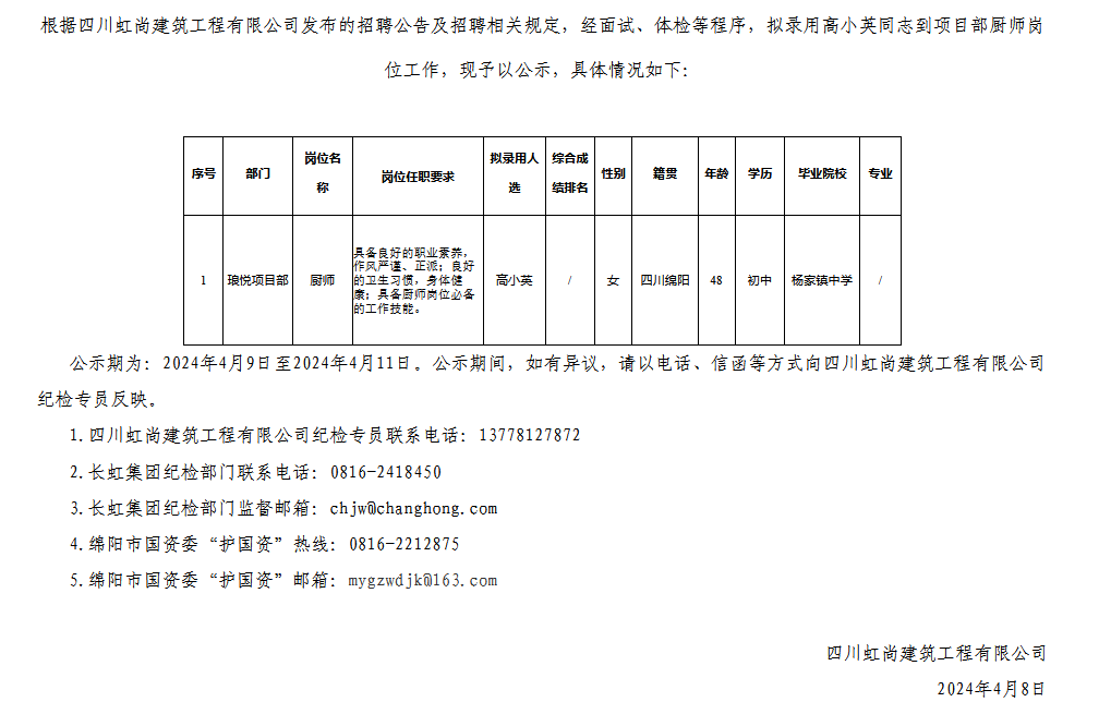 四川虹尚建筑工程有限公司關于招聘操作職員工擬錄用人員的公示