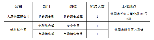 四川大道致遠(yuǎn)供應(yīng)鏈管理有限責(zé)任公司(以下簡(jiǎn)稱大道供應(yīng)鏈公司)是綿陽交通發(fā)展集團(tuán)有限責(zé)任公司旗下全資子公司,成立于2021年1月,注冊(cè)資本2900萬元,業(yè)務(wù)范圍覆蓋建筑用鋼筋產(chǎn)品銷售、水泥銷售、石油制品銷售等。綿陽交發(fā)大道新材料科技有限責(zé)任公司(以下簡(jiǎn)稱新材料公司)是大道供應(yīng)鏈公司旗下全資子公司,成立于2021年11月,主營(yíng)業(yè)務(wù)為廢舊瀝青再生技術(shù)研發(fā)與瀝青砼生產(chǎn)貿(mào)易?,F(xiàn)因公司經(jīng)營(yíng)發(fā)展需要,經(jīng)研究決定面向社會(huì)公開招聘,具體招聘情況如下: