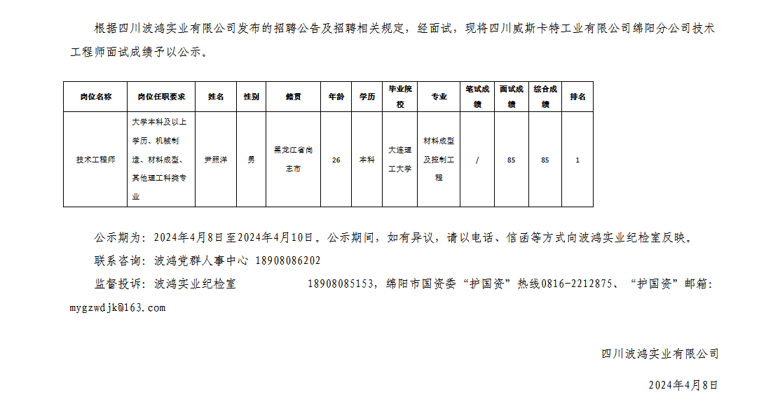 四川波鴻實(shí)業(yè)有限公司關(guān)于招聘四川威斯卡特工業(yè)有限公司綿陽分公司技術(shù)工程師測試成績的公示