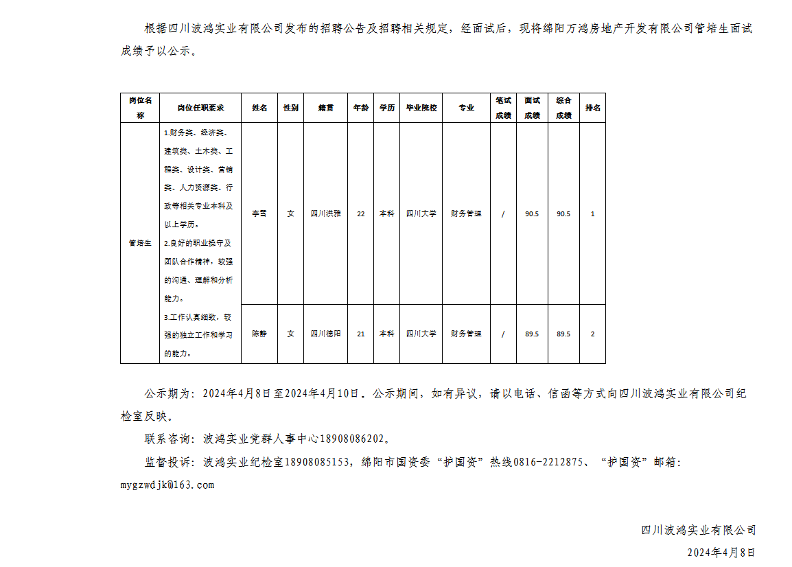 四川波鴻實(shí)業(yè)有限公司關(guān)于招聘綿陽(yáng)萬(wàn)鴻房地產(chǎn)開(kāi)發(fā)有限公司管培生測(cè)試成績(jī)的公示