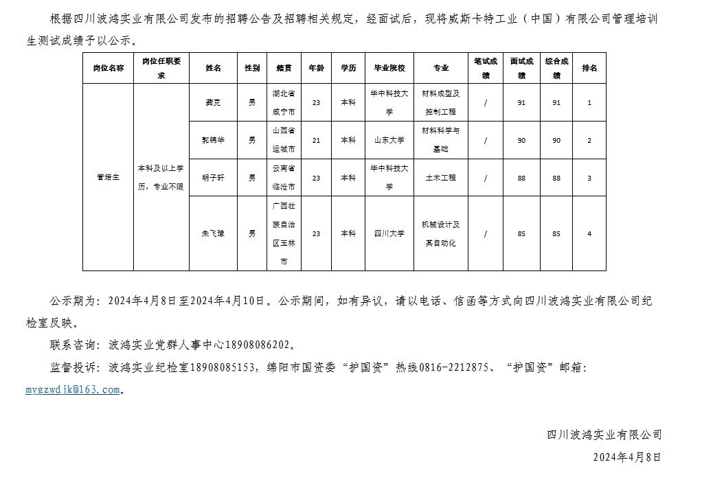 四川波鴻實(shí)業(yè)有限公司關(guān)于招聘威斯卡特工業(yè)(中國(guó))有限公司管培生測(cè)試成績(jī)的公示