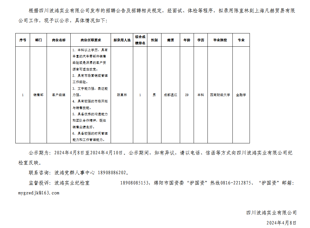 四川波鴻實(shí)業(yè)有限公司關(guān)于招聘上海凡赫貿(mào)易有限公司客戶經(jīng)理擬錄用人員的公示