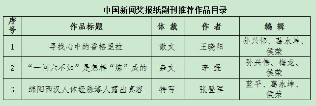 根據(jù)《中國新聞獎評選辦法》規(guī)定的程序,經(jīng)民主推薦及評委會評議,綿陽日報社擬推薦以下3件作品參加中國新聞獎報紙副刊作品的初評,現(xiàn)予以公示。公示期為4月9日至15日。如有異議,可通過書面、電話方式,于4月15日17時前進行反映。