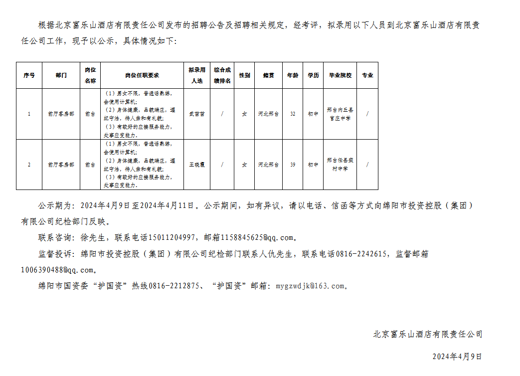 北京富樂山酒店有限責任公司關于3月招聘勤雜工崗位擬錄用人員的公示