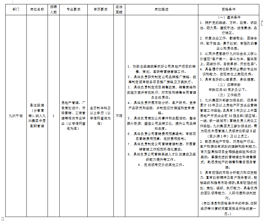 ?。ㄒ唬?yīng)聘者應(yīng)于報(bào)名時(shí)間內(nèi)將《四川九州投資控股集團(tuán)有限公司社會(huì)化選聘中層管理人員報(bào)名表》(詳見附件)及其他應(yīng)提供的報(bào)名資料,以圖片或PDF文件格式打包壓縮后請(qǐng)用“報(bào)名職位名稱+本人姓名”命名,發(fā)送至指定郵箱15196261795@163.com,聯(lián)系人張女士(組織人事部),聯(lián)系電話:0816-2468312。其他應(yīng)提供的報(bào)名資料包括:本人身份證、學(xué)歷學(xué)位證書(含學(xué)信網(wǎng)證明)、專業(yè)技術(shù)資格證書、職(執(zhí))業(yè)資格證書、工作經(jīng)歷證明(任職文件、勞動(dòng)合同等)、近年來主要工作業(yè)績(成果)、獲獎(jiǎng)證書等相關(guān)材料。(二)凡有下列情形之一的,不得報(bào)名1.因犯罪受過刑事處罰的。2.被開除中國共產(chǎn)黨黨籍的。3.被開除公職的。4.被依法列為失信聯(lián)合懲戒對(duì)象的。5.受到誡勉、組織處理或者黨紀(jì)政務(wù)處分等影響期未滿或者期滿影響使用的。6.涉嫌違紀(jì)違法正在接受有關(guān)機(jī)關(guān)審查尚未作出結(jié)論的。7.正在接受審計(jì)機(jī)關(guān)審計(jì)的。8.法律法規(guī)規(guī)定的其他情形。