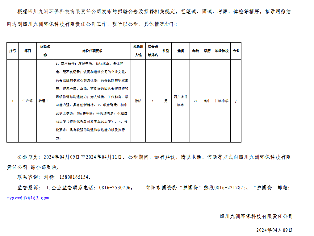 四川九洲環(huán)保科技有限責(zé)任公司關(guān)于招聘轉(zhuǎn)運工崗位擬錄用人員的公示