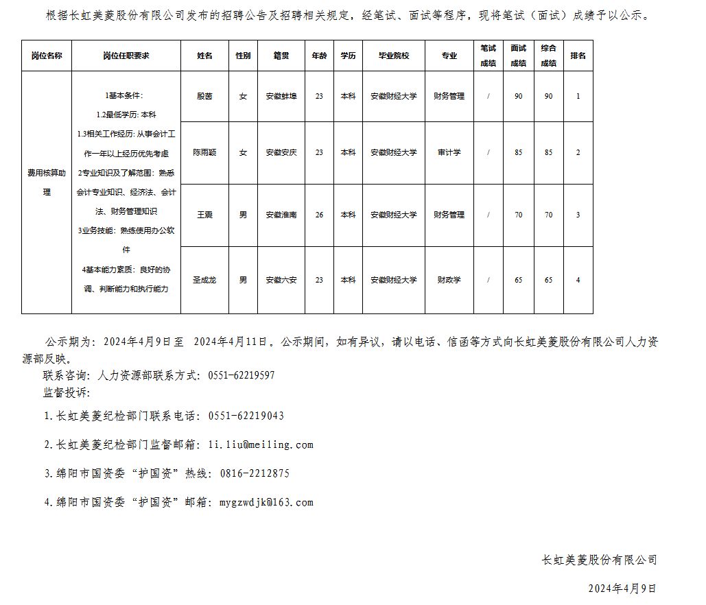 長虹美菱股份有限公司關(guān)于招聘費(fèi)用核算助理測試成績的公示