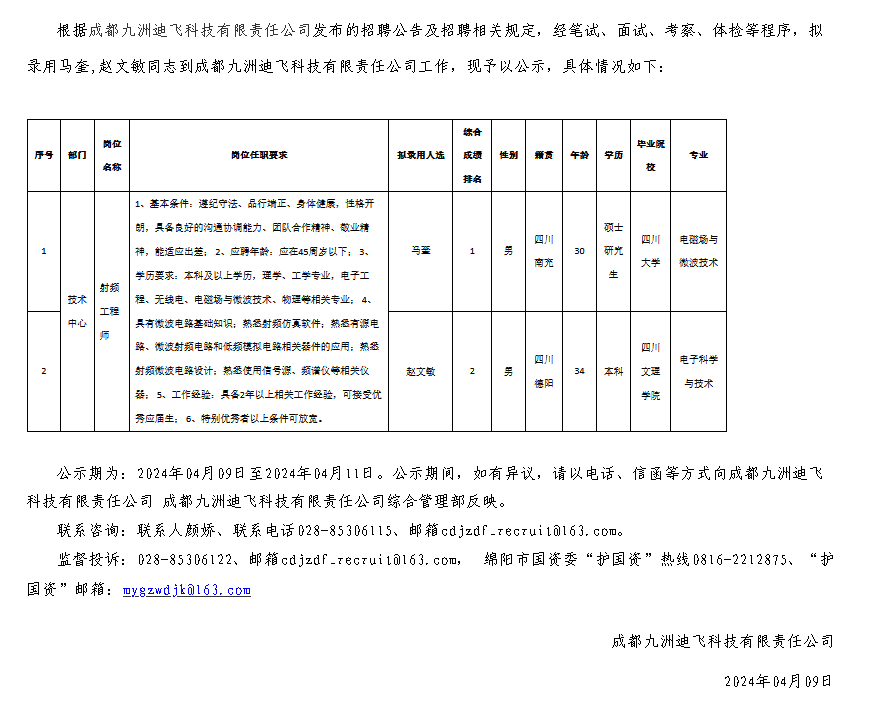 成都九洲迪飛科技有限責(zé)任公司關(guān)于招聘射頻工程師擬錄用人員的公示
