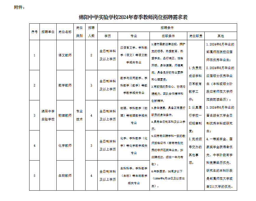 附件:《綿陽中學(xué)實(shí)驗(yàn)學(xué)校2024年春季招聘教師崗位需求表》