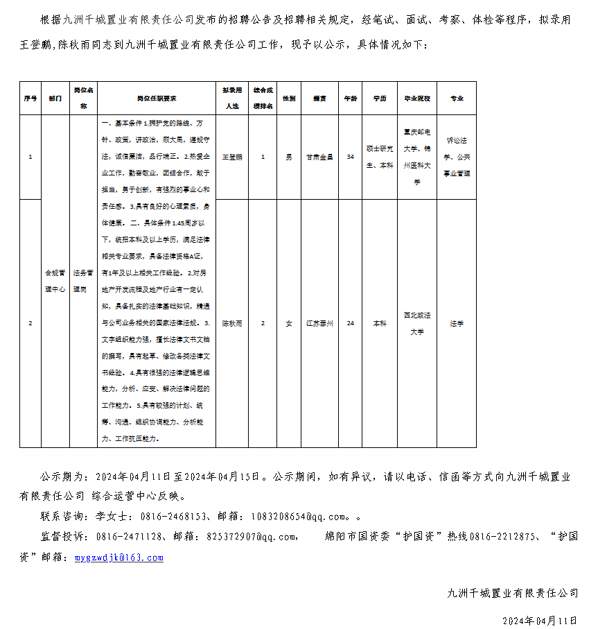 九洲千城置業(yè)有限責任公司關于招聘法務管理崗擬錄用人員的公示