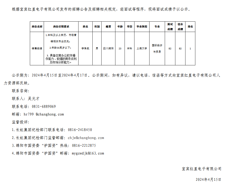宜賓紅星電子有限公司關(guān)于招聘銷售經(jīng)理崗位測試成績的公示