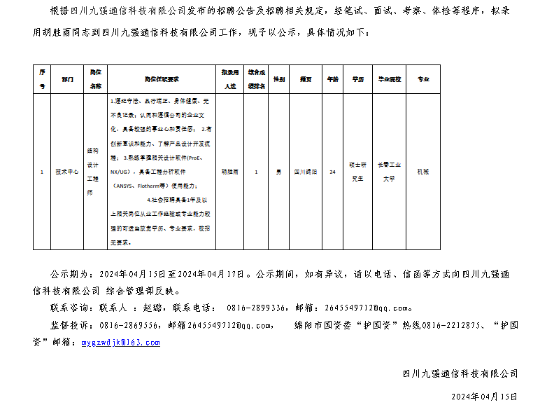 四川九強通信科技有限公司關于招聘結構設計工程師擬錄用人員的公示