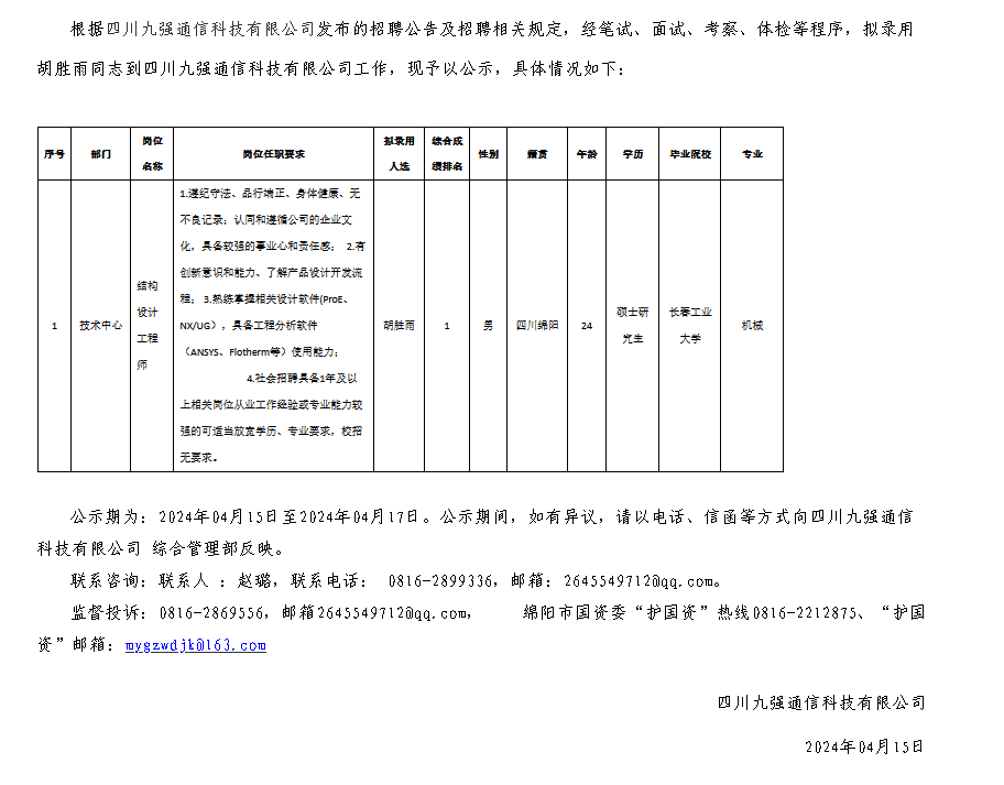 四川九強通信科技有限公司關于招聘結構設計工程師擬錄用人員的公示