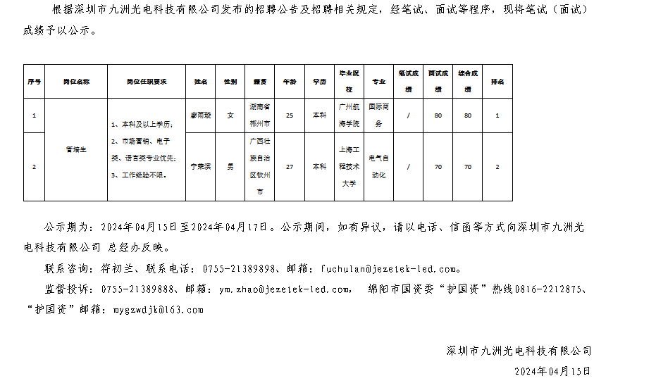 深圳市九洲光電科技有限公司關(guān)于招聘管培生崗位測試成績的公示
