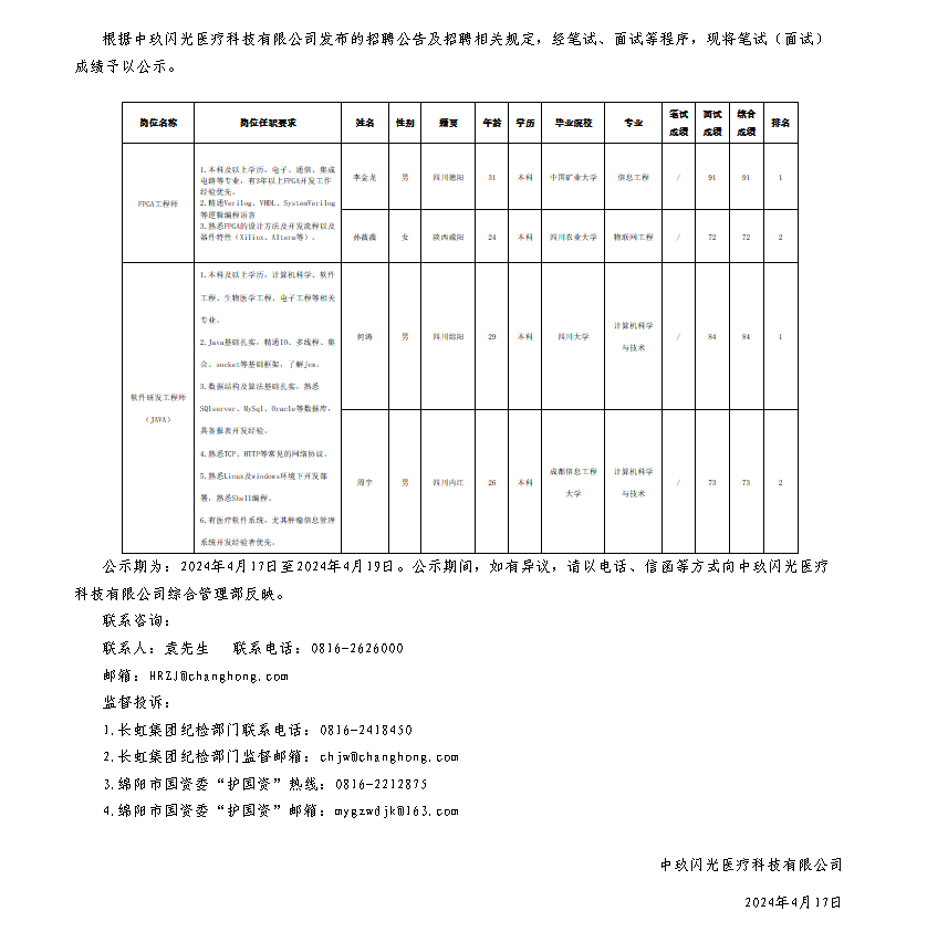 中玖閃光醫(yī)療科技有限公司關(guān)于招聘FPGA工程師等崗位測試成績的公示