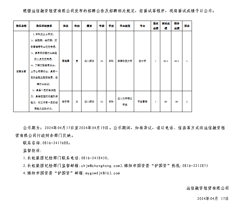 遠(yuǎn)信融資租賃有限公司關(guān)于招聘運(yùn)營(yíng)主管崗位測(cè)試成績(jī)的公示