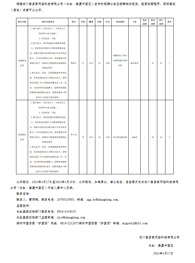 四川智易家網(wǎng)絡(luò)科技有限公司關(guān)于招聘電商服務(wù)運(yùn)營崗位測試成績的公示