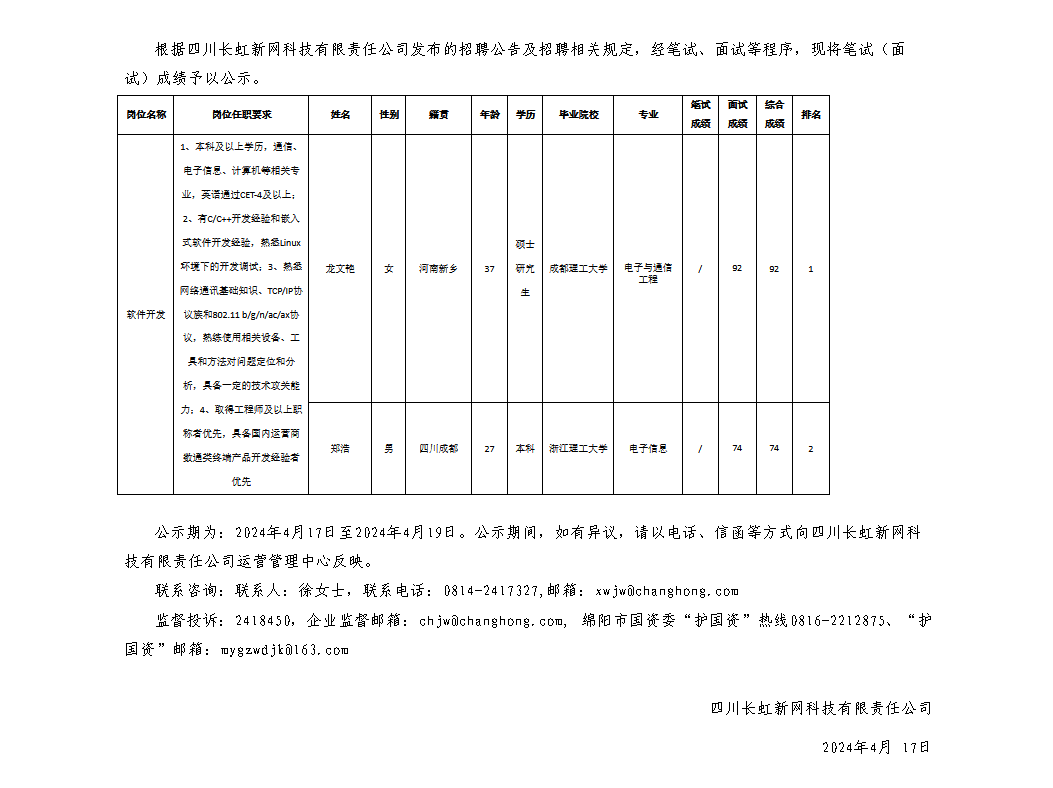 四川長虹新網(wǎng)科技有限責(zé)任公司關(guān)于招聘軟件開發(fā)崗位測試成績的公示