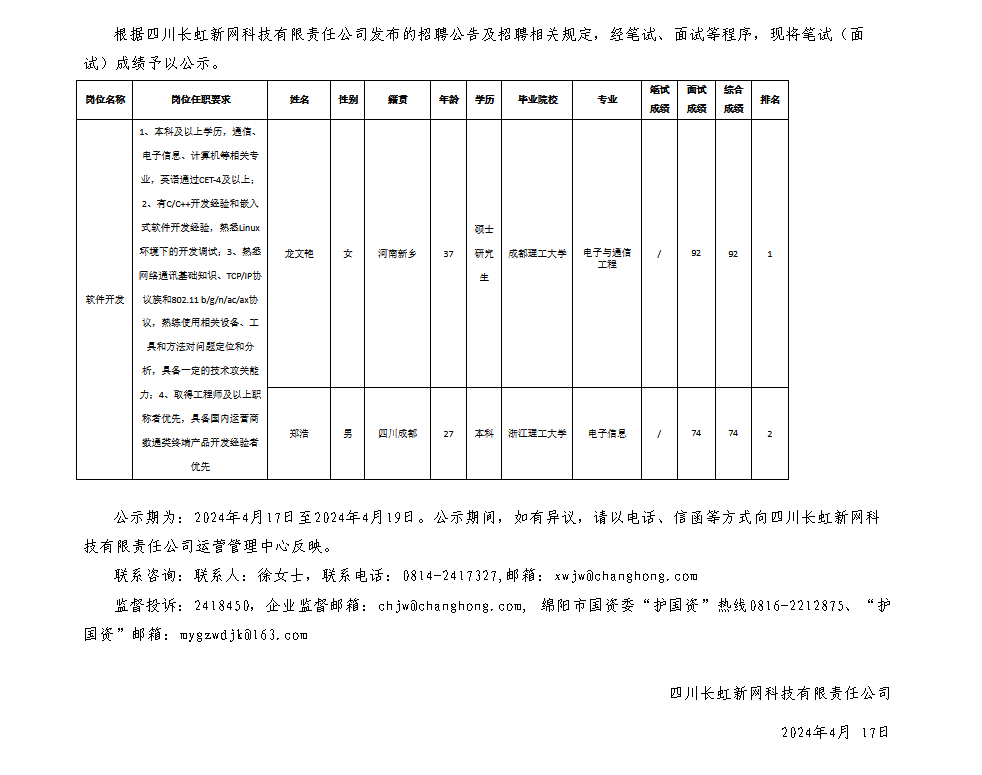四川長(zhǎng)虹新網(wǎng)科技有限責(zé)任公司關(guān)于招聘軟件開發(fā)崗位測(cè)試成績(jī)的公示