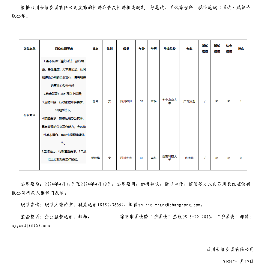 四川長虹空調有限公司關于招聘行政管理崗位測試成績的公示