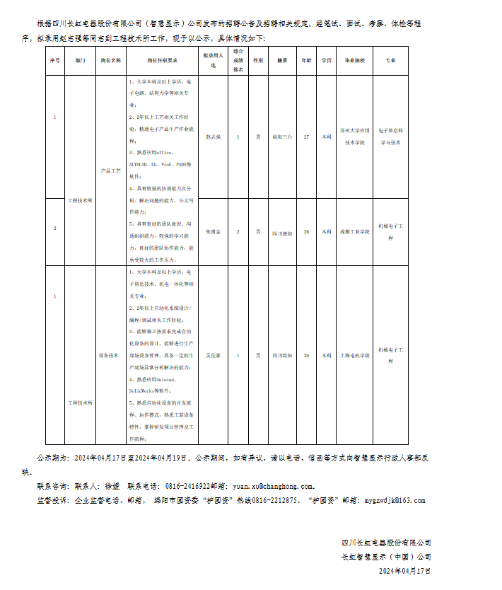 四川長虹電器股份有限公司(智慧顯示)關(guān)于招聘產(chǎn)品工藝等崗位擬錄用人員的公示
