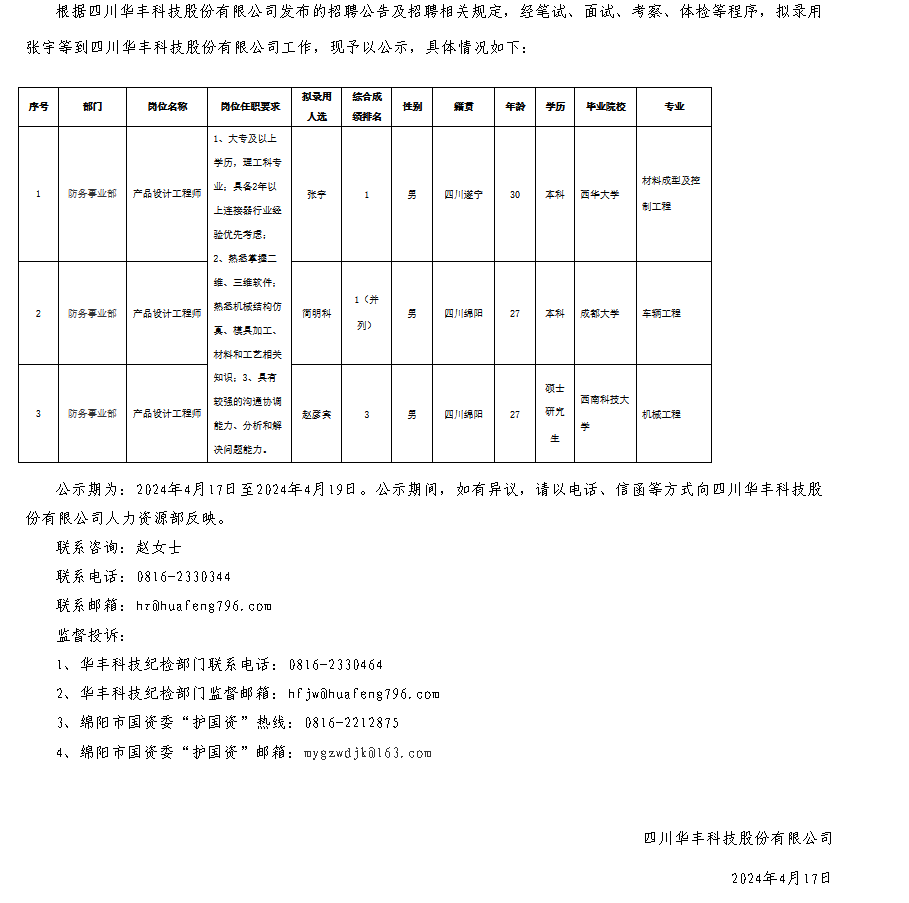 四川華豐科技股份有限公司關(guān)于招聘產(chǎn)品設(shè)計工程師擬錄用人員的公示