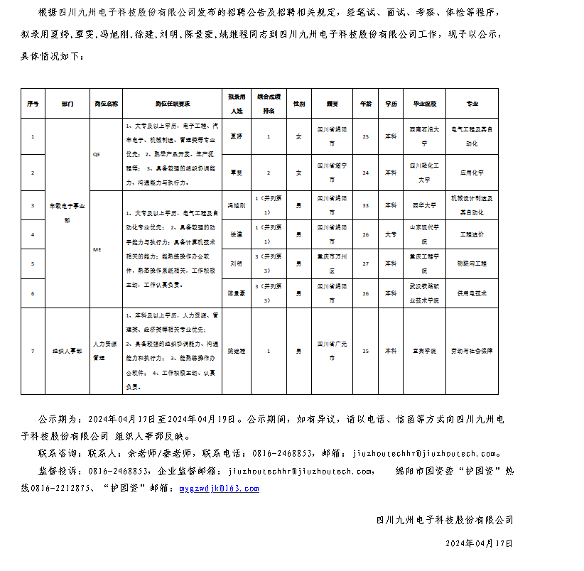 四川九州電子科技股份有限公司關(guān)于招聘QE等崗位擬錄用人員的公示
