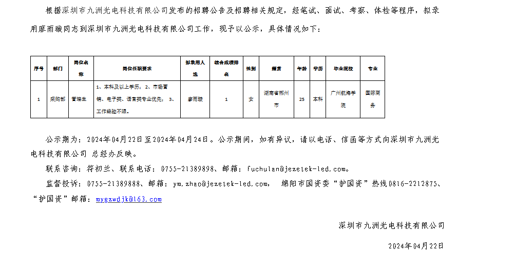 深圳市九洲光電科技有限公司關于招聘管培生擬錄用人員的公示