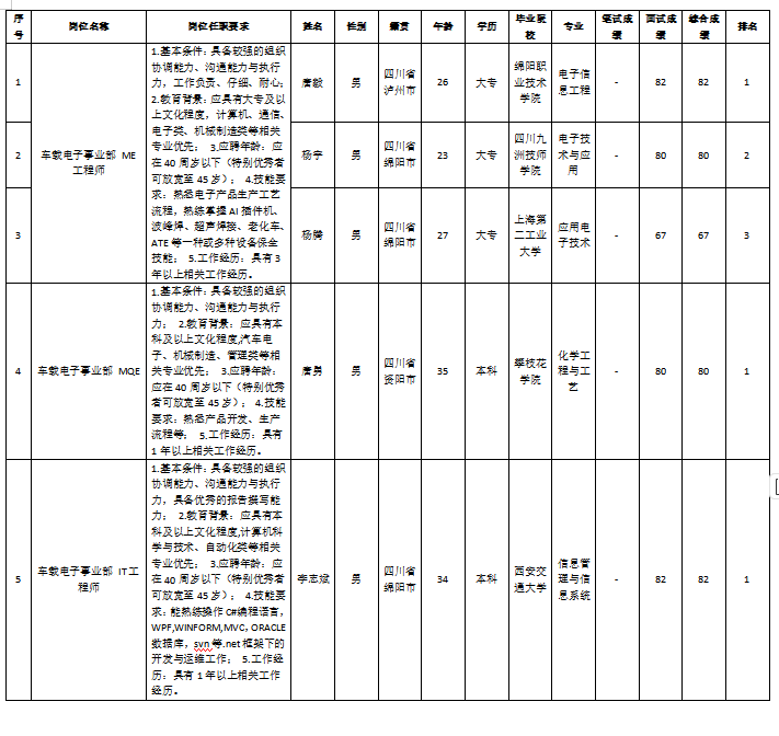 四川九州電子科技股份有限公司關(guān)于招聘ME工程師等崗位測(cè)試成績(jī)的公示