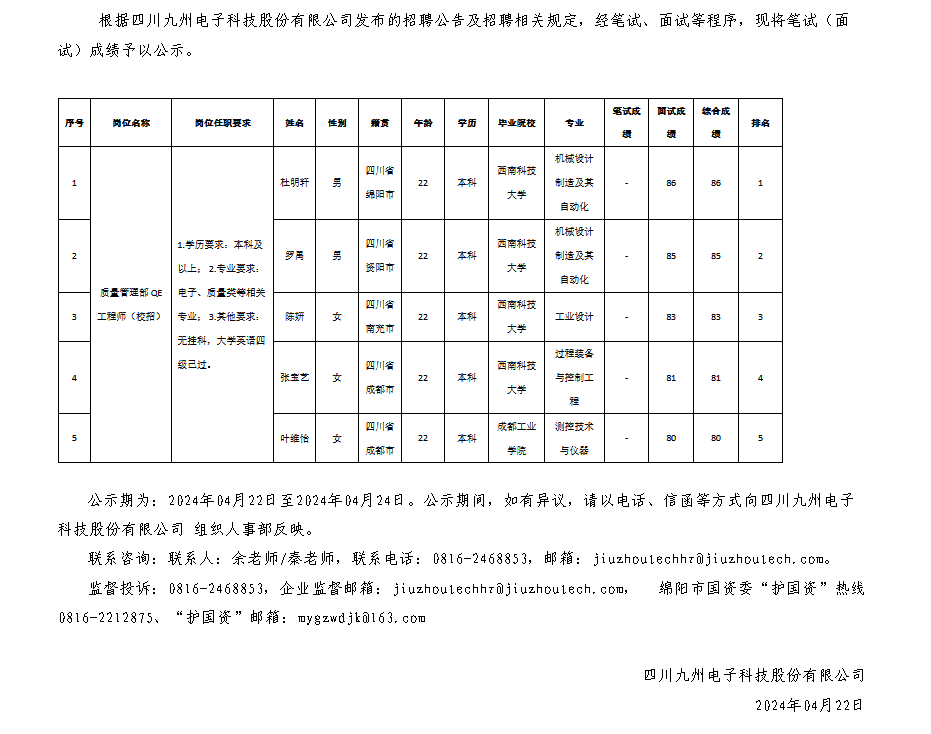 四川九州電子科技股份有限公司關(guān)于招聘QE工程師(校招)崗位測試成績的公示